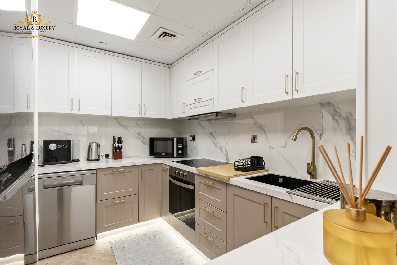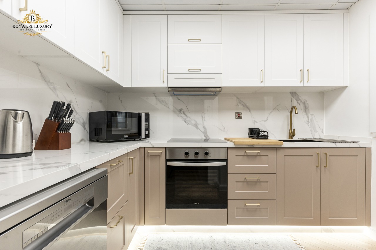 Kitchen: Fully equipped with fridge, stove, microwave, toaster, and washing machine