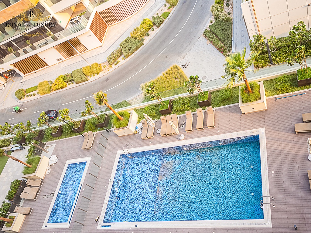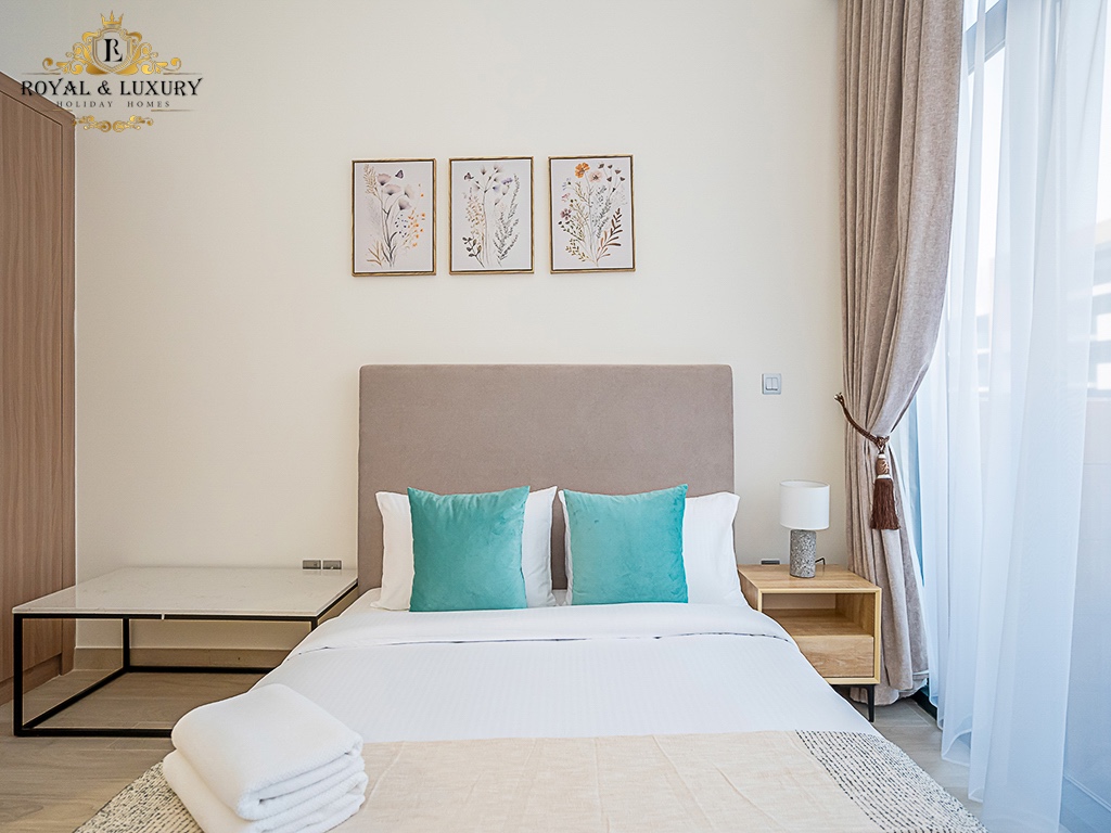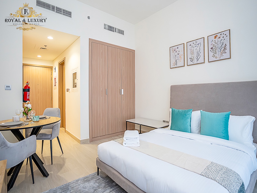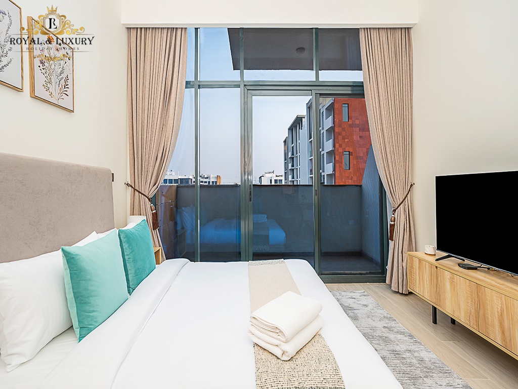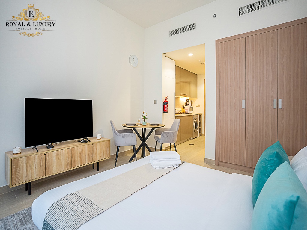 Step into a modern and elegant apartment designed with comfort and style in mind. The living space boasts high-quality finishes, large windows that flood the area with natural light, and a balcony offering stunning views of the Dubai skyline. The open-plan layout seamlessly connects the living, dining, and kitchen areas, creating a spacious and inviting atmosphere.