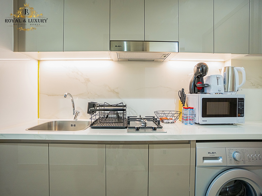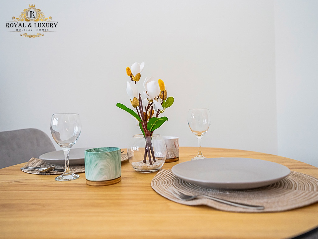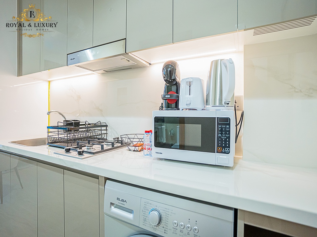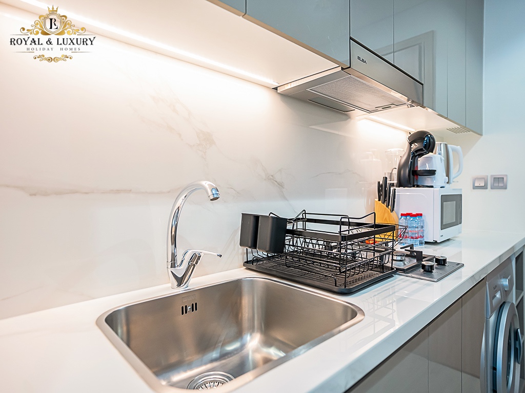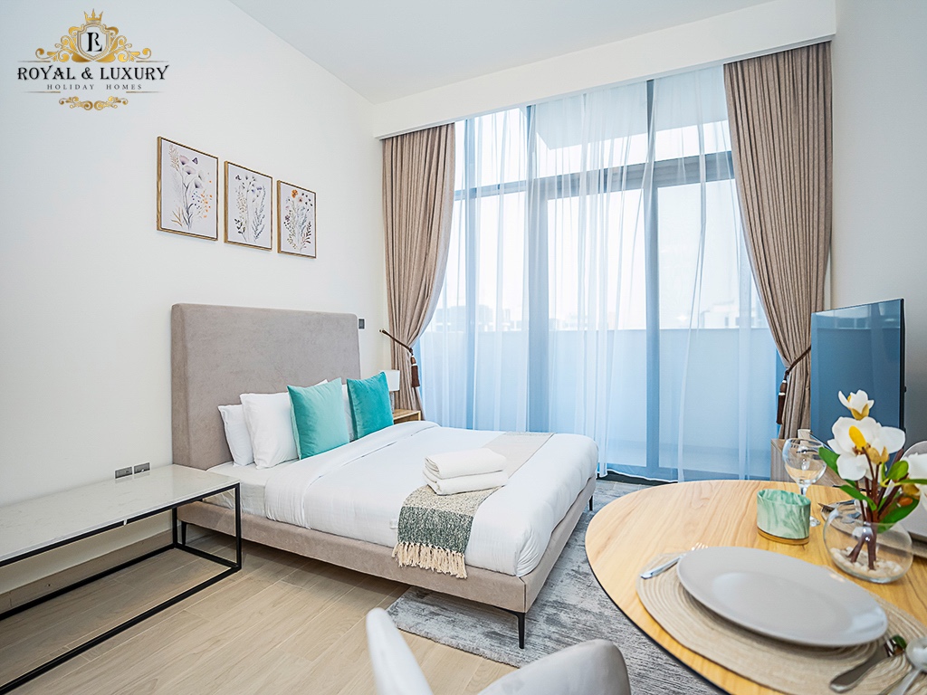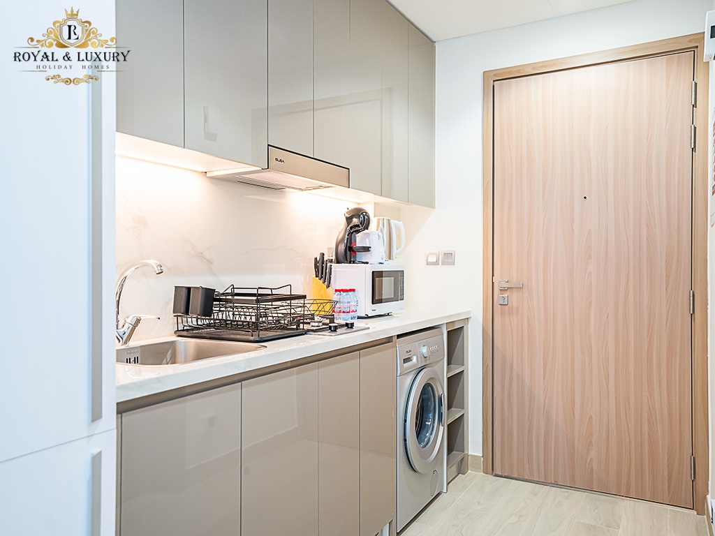 Step into a modern and elegant apartment designed with comfort and style in mind. The living space boasts high-quality finishes, large windows that flood the area with natural light, and a balcony offering stunning views of the Dubai skyline. The open-plan layout seamlessly connects the living, dining, and kitchen areas, creating a spacious and inviting atmosphere.